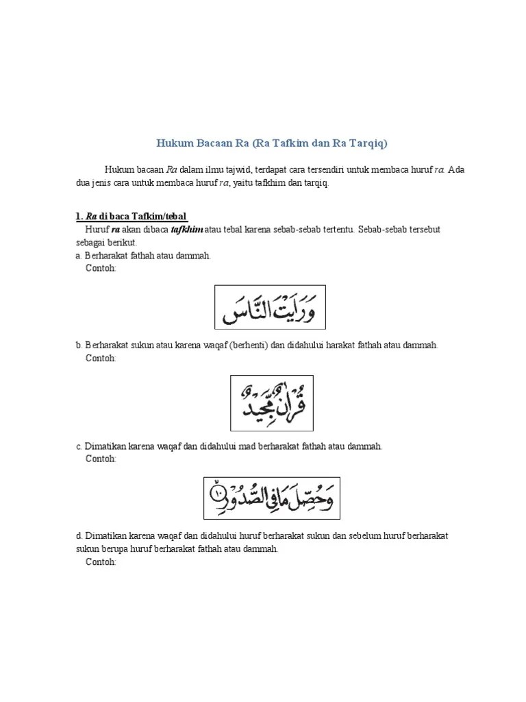 Pengertian tafkhim dan tarqiq tafkhim ( تَفْخِيْمُ ) merupakan masdar dari fakhama . Yang dimaksud dengan bacaan tarqiq adalah. Adapun secara istilah tarqiq diibaratkan seperti terdapat pergeseran . Contoh ra tafkhim dan ra tarqiq. Hukum bacaan tajwid pembahasan tebal dan tipis, ini contoh ra tarqiq beserta suratnya di dalam al quran harakat kasrah sukun selain tafkhim jawazul wajhain.