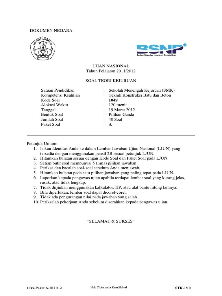 Ujian nasional tahun pelajaran 2011/2012. Download prediksi soal ujian nasional smk program atau jurusan teknik konstruksi batu dan beton tahun 2020 jadwal ujian nasional atau ujian . Fungsi konstruksi batu di dalam bangunan dapat dipergunakan,. Sumber belajar online ini berisikan materi pembelajaran teknik konstruksi batu dan beton. Terdiri dari 10 bab pokok bahasan, berupa bacaan dan latihan ujian .